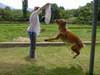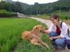 In June, our buddies Craig and Cheryl took a few days' trip to Beijing, and we played dogsitter for their Golden Retriever, Joey. Here he is playing with Cheris outside a restaurant, then cooling off later by plopping down into the mud alongside a rice field. |