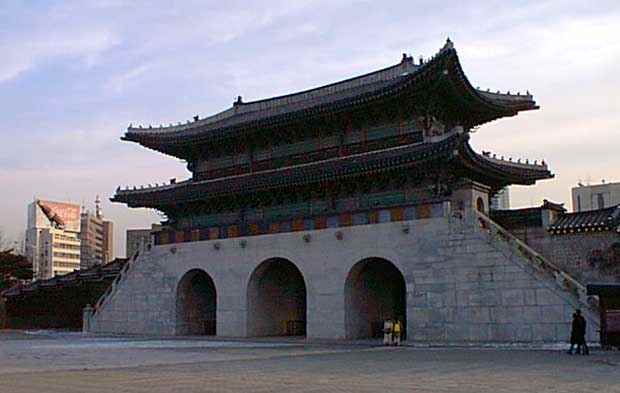 The old north gate to the city near Kongbukkung, with the contrast of modern Seoul in the background. |