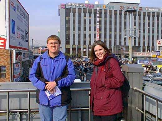 Chad and Cheris outside the enormous Youngsan Electronics Mall, with what seemed like the entire population of Seoul crossing the street in the background. |