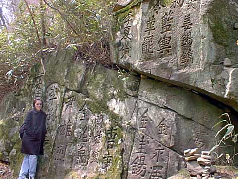 | Cheris next to a rock face carved with intricate Chinese characters. |