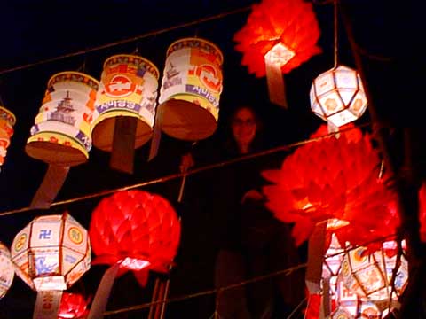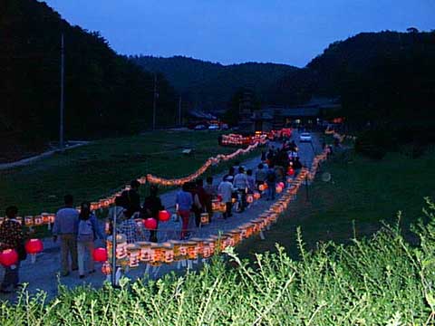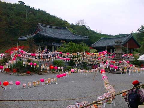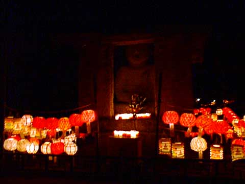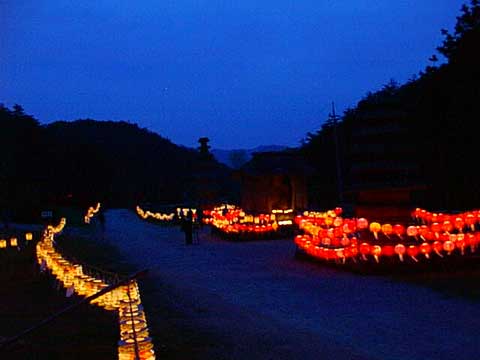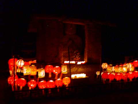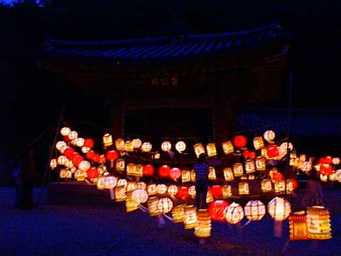 ![]() We went back to this temple a third time for the Buddha's Birthday 2001 festivities. Just as we'd seen on this holiday in the two previous years, there were lanterns strung up all over the grounds, which we all helped to light as darkness fell. It was a gorgeous spring day and an even more beautiful evening as the candles lit up the valley. We had a great time, and even got a few decent pictures of the lanterns in the darkness.